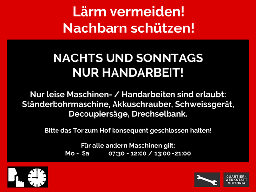 Die Quartierwerkstatt VIKTORIA ist für Mitglieder rund um die Uhr geöffnet. Es gelten Ruhezeiten (Arbeiten ohne Lärm).