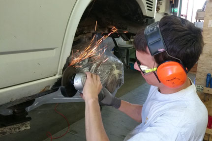 Im Bereich der Schreinerei verfügen wir neben den Holz-Maschinen zusätzlich auch über einen hydraulischen Auto-Lift (Arbeitsplatz 4) und einen Inspektionsgraben, mit denen Du Wartungsarbeiten an deinem Fahrzeug durchführen kannst.